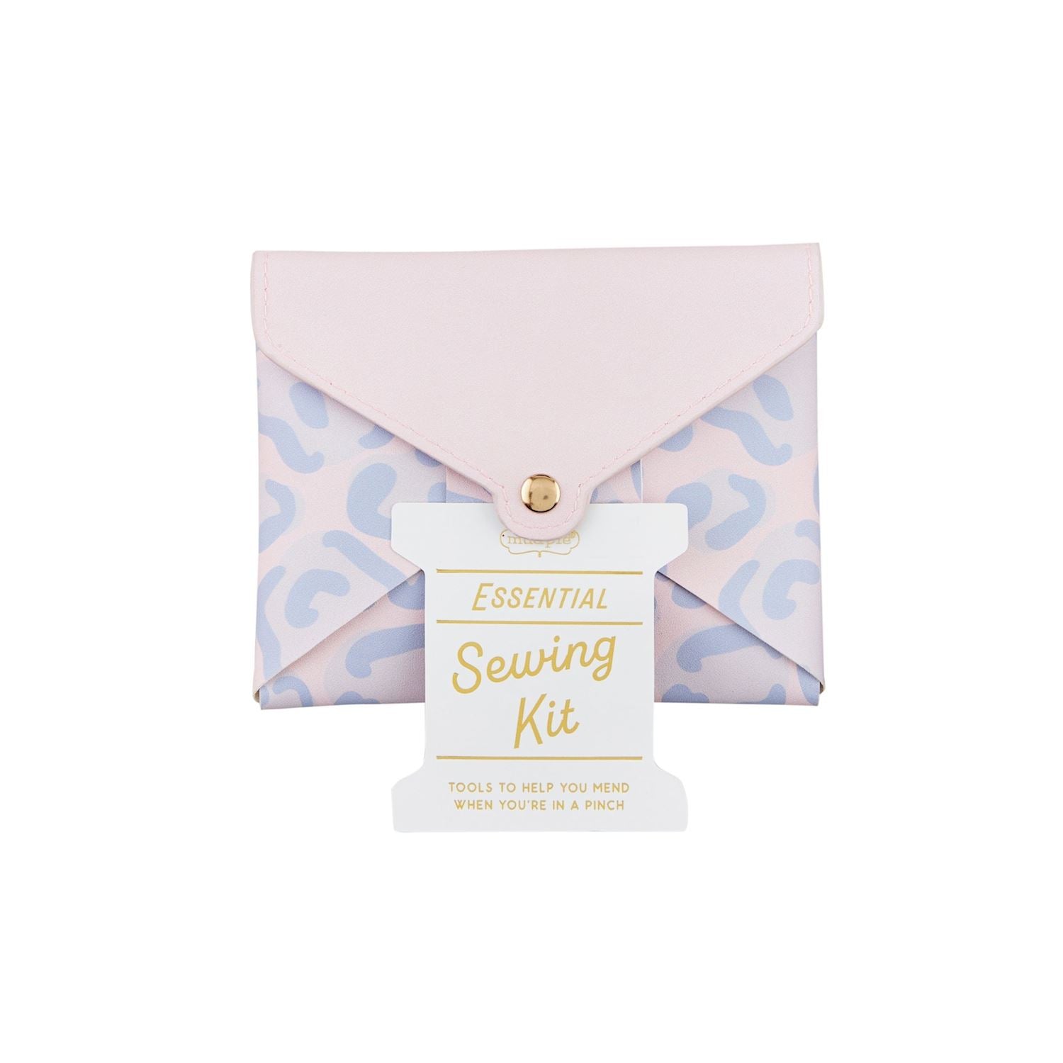9-piece set. Faux leather sewing kit with snap closure includes: measuring tape, thimble, set of assorted threads, seam ripper, pack of safety pins, scissors, pack of assorted needles and needle threader.