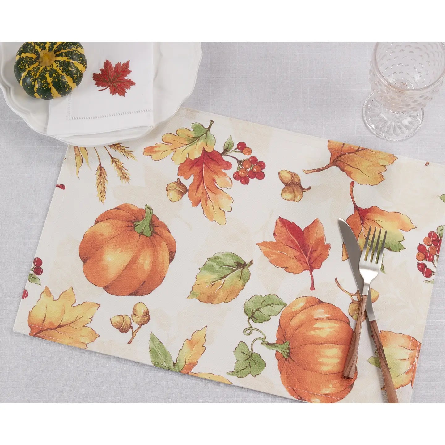 Featuring a beautiful combination of pumpkins and autumn foliage on a light background, this charming set of Fall Pumpkin Placemats is a great addition to your décor for the autumn months. It can also make for a lovely Thanksgiving table décor. Pair the set with a matching runner for a coordinated look.