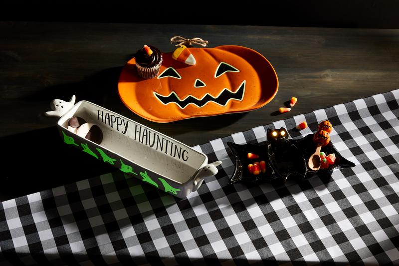 The Jack-O-Lantern Glow Platter is a stunning addition to your Halloween decor. Crafted from high-quality ceramic, this platter features a hand-painted speckle design that adds a touch of whimsy to any table setting. The real magic happens when the lights go down, as the platter's glow-in-the-dark glaze illuminates the intricate Jack-O-Lantern design, creating a spooky and enchanting ambiance. Measuring 12" x 16", this platter is the perfect size for serving up your favorite Halloween treats or displaying festive decorations. Made from durable dolomite, this platter is built to last and can be enjoyed year after year. Whether you're hosting a Halloween party or simply looking to add a touch of Halloween spirit to your home, the Jack-O-Lantern Glow Platter is sure to impress.