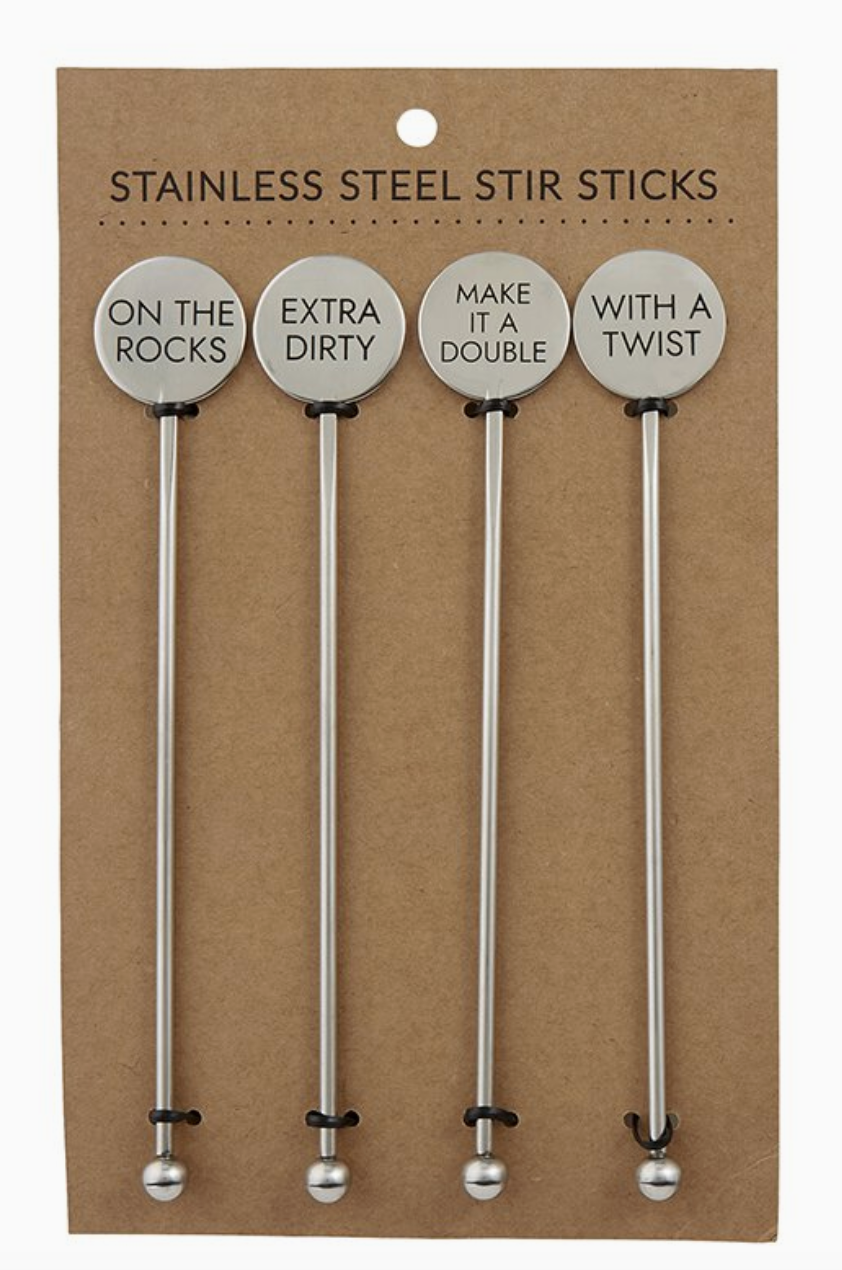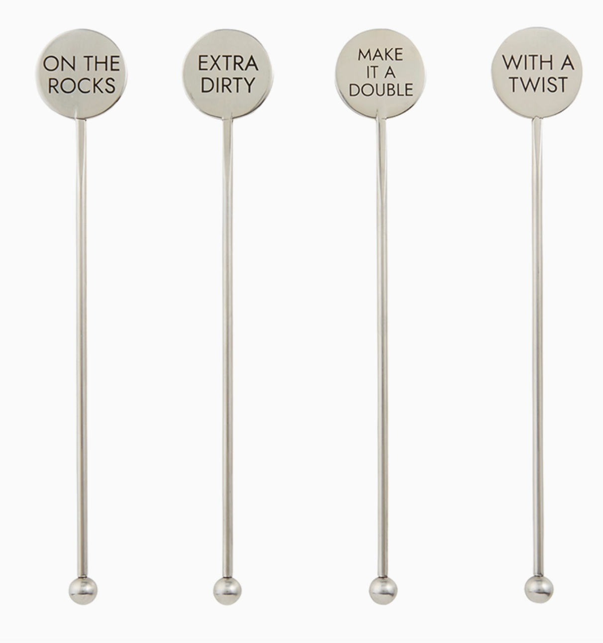 Mix it up with Stainless Steel Stir Sticks. · Hand Wash for Reuse · Set includes 4 different phrases · Material: Stainless Steel · Size: 5" L · Care Instructions: Hand Wash Only