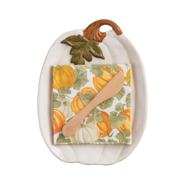 Elevate your dining experience with this exquisite White Pumpkin Plate Napkin Set, a charming 3-piece collection perfect for any occasion. The hand-painted stoneware plate showcases intricate detailing, adding a touch of elegance to your table setting. Measuring 7" x 8", it's ideal for serving appetizers or desserts. Complementing the plate is a pack of 12 paper dinner napkins, each 10" x 10", featuring a delightful design that enhances the seasonal theme. The set is completed with a 5 1/2" wooden spreader, perfect for serving spreads or soft cheeses. Crafted with quality and style in mind, this set is a must-have for those who appreciate fine dining and festive decor.